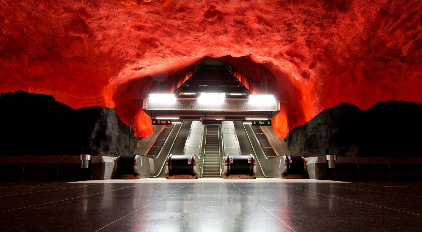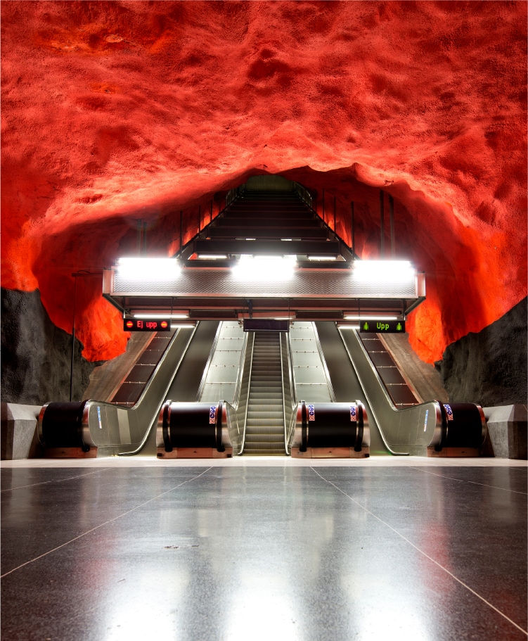 1970年代に完成したソルナ・セントラム駅は、とりわけ強烈な印象を残す。岩肌が剥き出しになった洞窟のような駅。壁も天井も真っ赤に染められている。頭上に広がるのは燃えるように赤い世界だ。森を思わせる緑色とのコントラストも美しく映える。降り立った瞬間、あっと驚かずにはいられないだろう。