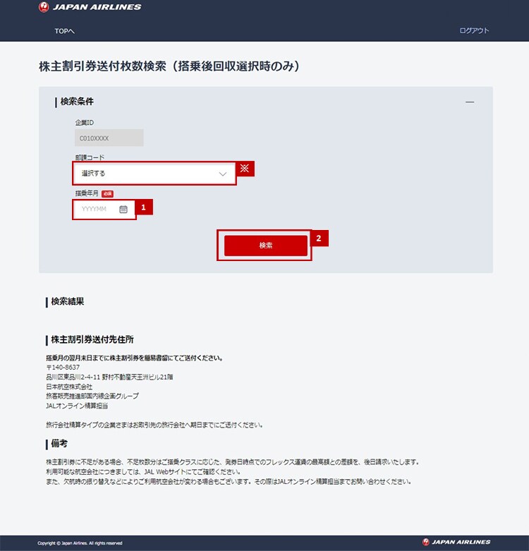 | レポート | 送付枚数確定後にレポート内「株式割引券送付枚数検索」ご確認いただけます。 該当の明細はレポート内「JALオンラインレポート」内でご確認いただけます。 |