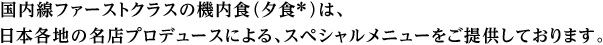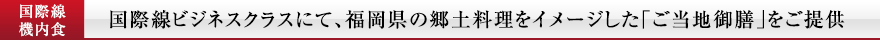 国際線のビジネスクラス(*)にて、福岡県の郷土料理をイメージした「福岡御膳」をご提供します。「青高菜漬け」や「おきゅうと」を用いるなど、福岡県の郷土料理の美味を追求しました。
