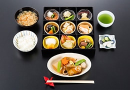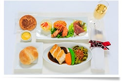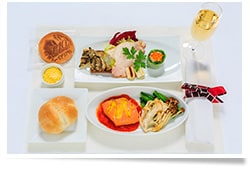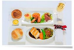 国際線のビジネスクラス(*)にて「新潟茶豆塩茹(新潟県)」や「加賀蓮根天麩羅(石川県)」など、新潟県をはじめ北陸各地の食材を利用した「北陸御膳」をご提供します。