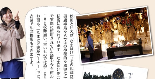 秋田空港を擁する秋田市から約70kmとほどよい距離で、秋田市の街散策とセットで楽しめるのも魅力です。男鹿でハタハタ、秋田市内で名物の稲庭うどんや新鮮な魚介類を堪能するグルメ巡りも見逃せません。そんな男鹿〜秋田市内の魅力を、地元出身の客室乗務員がご案内。独特の文化が息づく秋田の魅力をたっぷりお届けします。