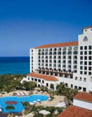 赤瓦屋根に白い壁のスパニッシュコロニアルスタイルの外観が、目の前の青い海に映える「ホテル日航アリビラ」。プライベート感覚を重視したワンランク上のリゾートホテル。2010年12月、TripAdvisorの「彼女の好きなホテル、彼の好きなホテル」で男女ランキング共に1位に輝いた。