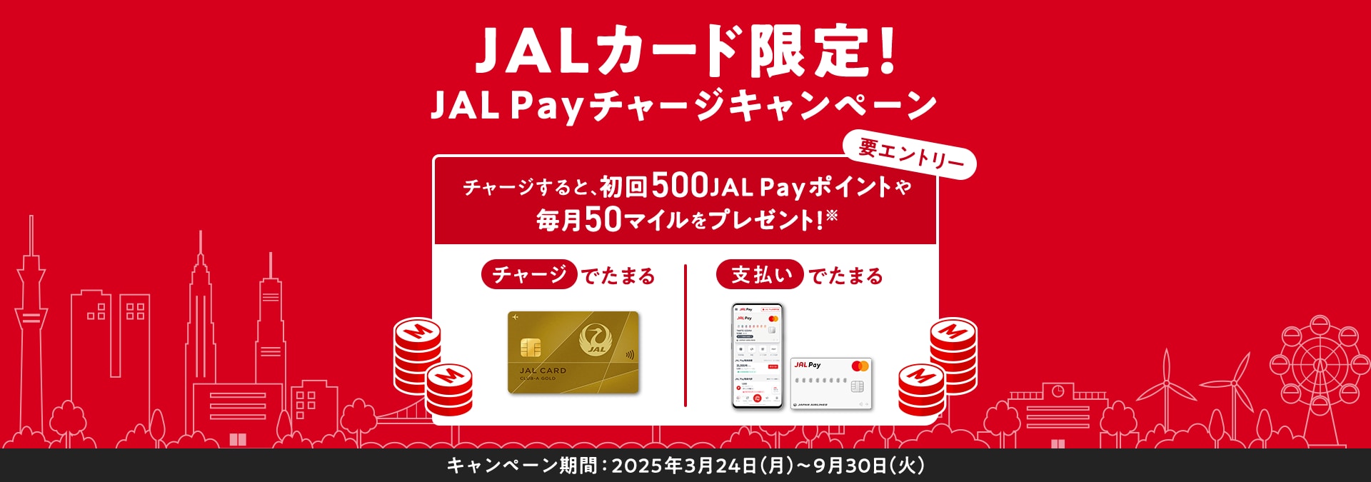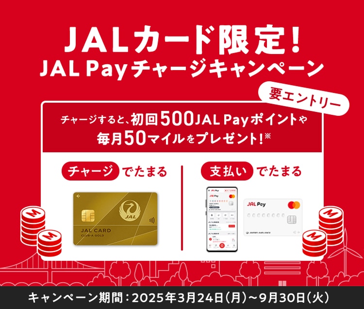 期間中に、JALカードからJAL Payに毎月1回につき5,000円以上チャージすると50マイル/月