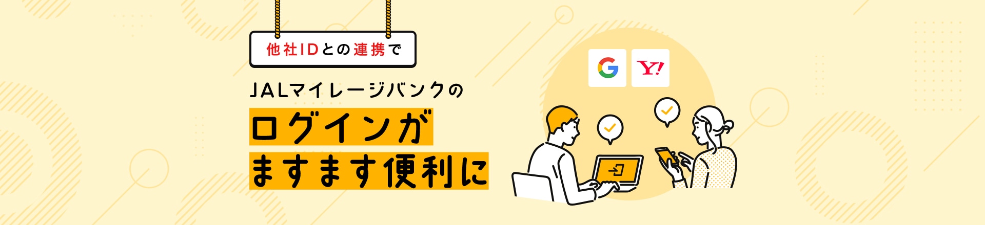 普段ご利用いただいている他社サービス(Google,Yahoo! JAPAN,LINE)のIDとお得意様番号を連携することで、次回よりかんたんにJALマイレージバンクへログインすることができます。