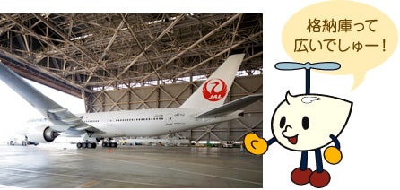 整備をする飛行機は、力の強い特別な自動車で引っ張って格納庫に移動させます。作業用の大きな足場を動かして、整備士の人たちが作業しやすい位置にセットしたら、準備完了!