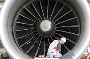 飛行機の心臓ともいうべきエンジンの点検は、とても大切。 ふつうエンジンは、何枚もの羽根がちょうど扇風機のように組み合わされて、 強力な風を後ろにふき出します。 整備では、この羽根の1枚1枚まで、念入りに点検しています。