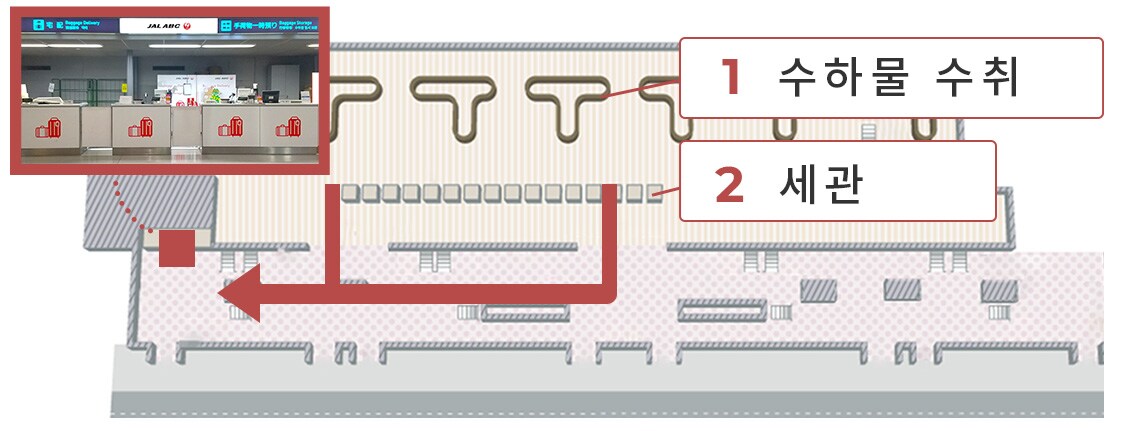 1. 공항 도착 후 도착 로비에 있는 JAL ABC 카운터로 이동합니다. 사전에 서비스를 신청하지 않은 경우 카운터에서 2D 바코드를 스캔하여 신청할 수 있습니다. 2. 신청 완료 후 포스터 옆에 있는 발급기에서 수하물 스티커를 발급하여 여행 가방에 부착한 후 JAL ABC 카운터에서 체크인합니다. |