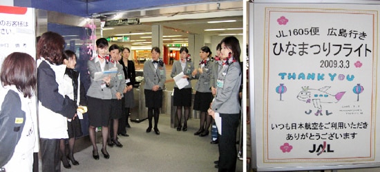 ももの節句の2009年3月3日、羽田発広島行きJAL1605便を「ひなまつりフライト」として、機長と整備責任者以外は全て女性スタッフがフライトの準備・運航を行い、ご搭乗の皆さまへ日頃の感謝の気持ちをお伝えしました。