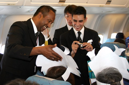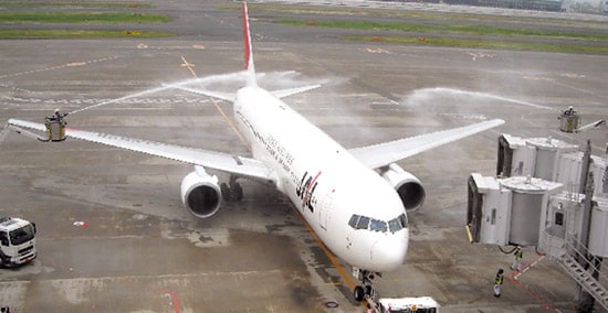 5月5日に「こいのぼりフライト」を実施しました。こどもの日にちなみ、機内は全て男性客室乗務員が乗務し、ロンドンから男性の客室乗務員も参加して、機内で柏餅やメッセージカードの配布、フレームを使った写真撮影会を行いました。お客さまからは、「楽しみにしていました。」や「また行いますか?」といったコメントも頂戴しフライトを楽しんで頂きました。また、便出発時には横断幕によるお見送りとともに「水のアーチ」も行われ、皆さまへの日頃の感謝の気持ちをお伝えしました。
