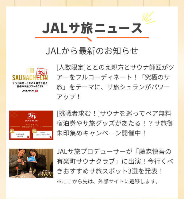 JALサ旅ニュース [人数限定]ととのえ親方とサウナ師匠がツアーをフルコーディネート!「究極のサ旅」をテーマに、サ旅シュランがパワーアップ! JALサ旅プロデューサーが「藤森慎吾の有楽町サウナクラブ」に出演!今行くべきおすすめのサ旅スポット3選を発表!ここから先は、外部サイトに遷移します。