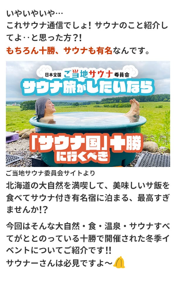 皆さまもぜひ北海道十勝で、サウナ・サ飯を堪能ください! JALサ旅ダイナミックパッケージはこちらから JALサウナ通信メルマガ配信停止はこちら