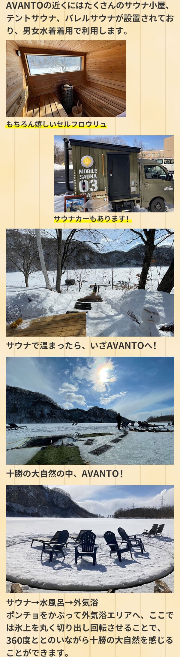 ところで皆さんAVANTO(読み方:アヴァント)をご存知でしょうか?サウナの本場フィンランドで愛される、凍った湖に穴をあけて水風呂代わりにする文化のことを言います。 サウナ小屋 テントサウナ バレルサウナ