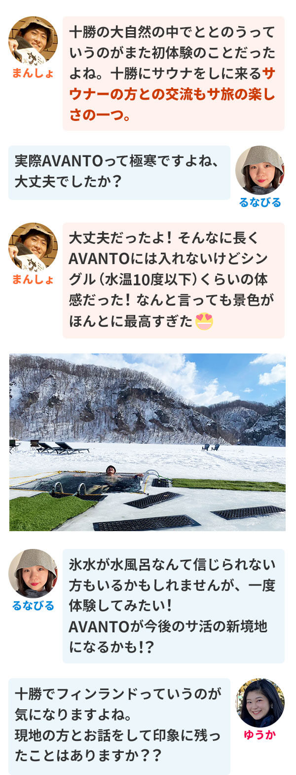 まんしょ 十勝の大自然の中でととのうっていうのがまた初体験のことだったよね。十勝にサウナをしに来るサウナーの方との交流もサ旅の楽しさの一つ。るなびる 実際AVANTOって極寒ですよね、大丈夫でしたか? AVANTO