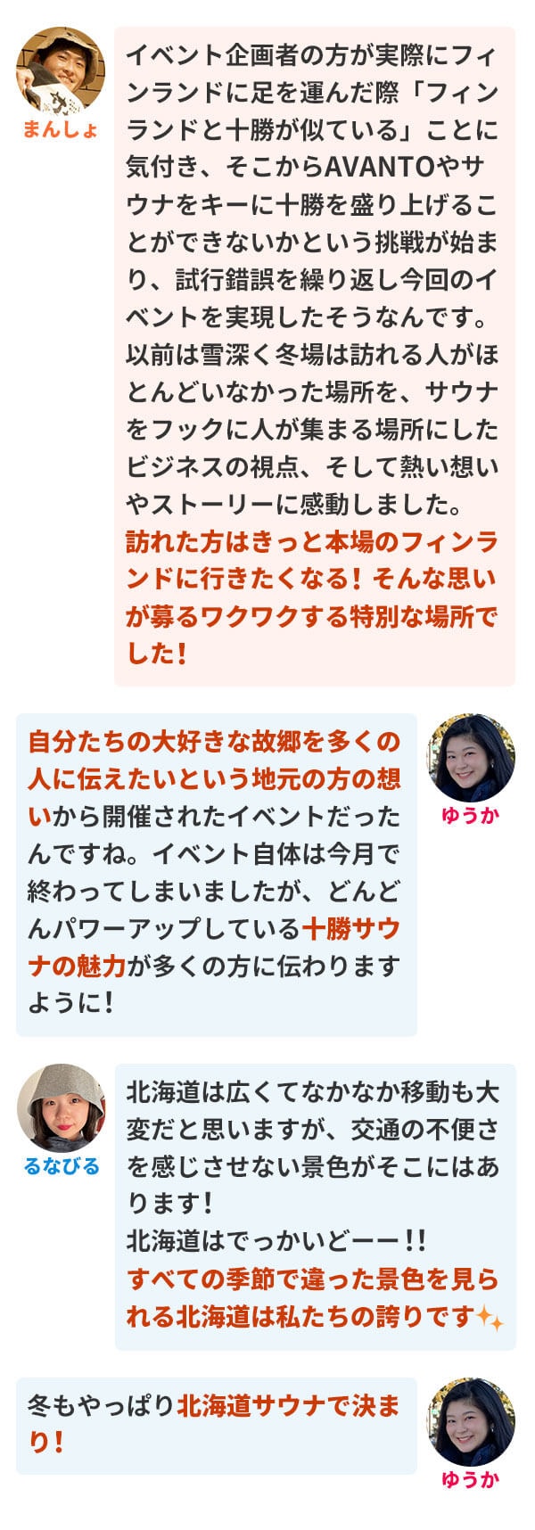 まんしょ イベント企画者の方が実際にフィンランドに足を運んだ際「フィンランドと十勝が似ている」ことに気付き、そこからAVANTOやサウナをキーに十勝を盛り上げることができないかという挑戦が始まり、試行錯誤を繰り返し今回のイベントを実現したそうなんです。