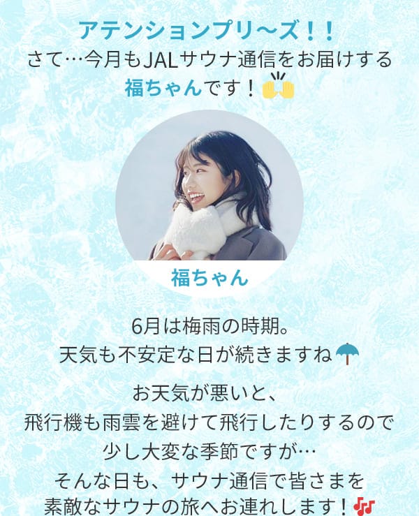 アテンションプリ~ズ!!さて…今月もJALサウナ通信をお届けする福ちゃんです!6月は梅雨の時期。天気も不安定な日が続きますね お天気が悪いと、飛行機も雨雲を避けて飛行したりするので少し大変な季節ですが…そんな日も、サウナ通信で皆さまを素敵なサウナの旅へお連れします!