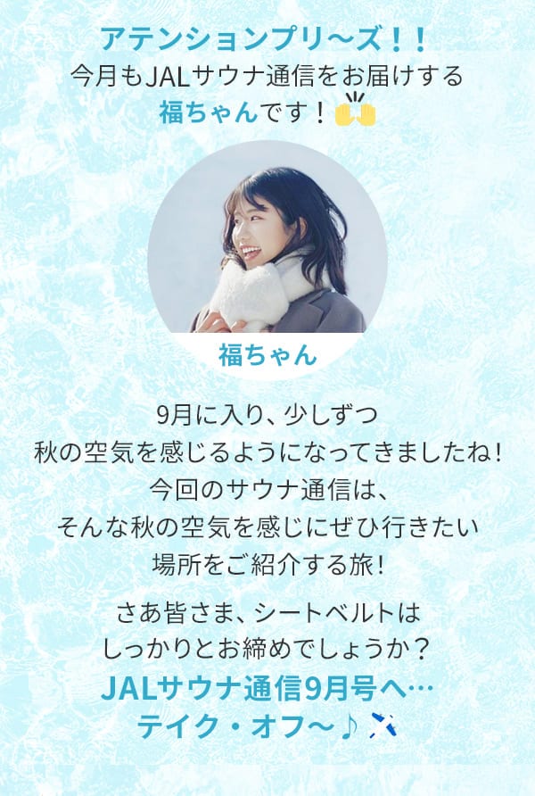 アテンションプリ~ズ!!今月もJALサウナ通信をお届けする福ちゃんです!9月に入り、少しずつ秋の空気を感じるようになってきましたね!今回のサウナ通信は、そんな秋の空気を感じにぜひ行きたい場所をご紹介する旅!さあ皆さま、シートベルトはしっかりとお締めでしょうか?JALサウナ通信9月号へ…テイク・オフ~