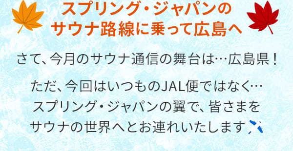 スプリング・ジャパンのサウナ路線に乗って広島へ さて、今月のサウナ通信の舞台は…広島県!ただ、今回はいつものJAL便ではなく…スプリング・ジャパンの翼で、皆さまをサウナの世界へとお連れいたします