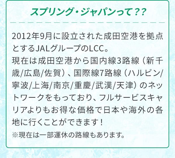 スプリング・ジャパンって??2012年9月に設立された成田空港を拠点とするJALグループのLCC。現在は成田空港から国内線3路線(新千歳/広島/佐賀)、国際線7路線(ハルビン/寧波/上海/南京/重慶/武漢/天津)のネットワークをもっており、フルサービスキャリアよりもお得な価格で日本や海外の各地に行くことができます!
