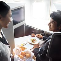 シャンパン、ペリエなど、プレミアムエコノミークラス ならではのお飲み物をお楽しみください。 軽食もご用意しております。