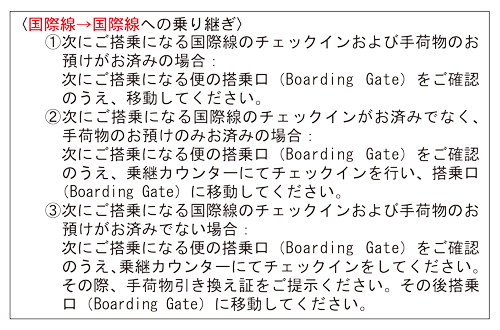 お乗継のお客さまは、下記要領で乗継および搭乗手続きを行ってください。