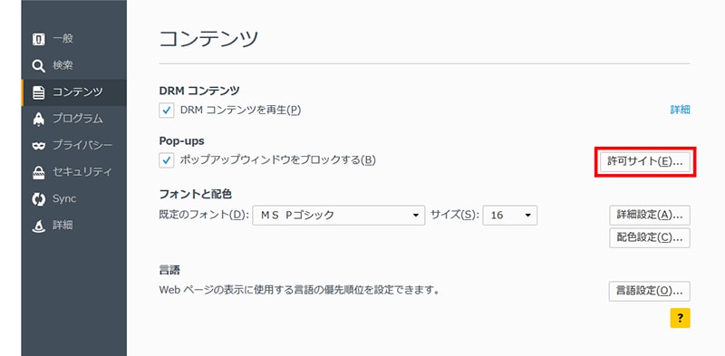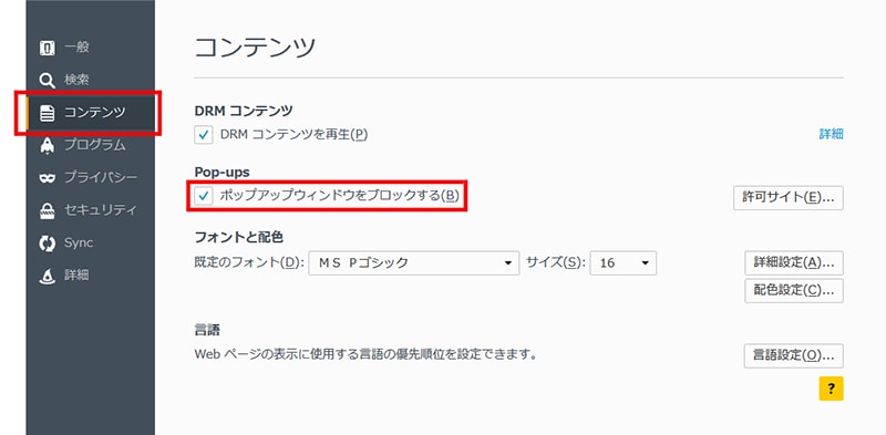 「コンテンツ」タブを選択し、「ポップアップウィンドウをブロックする」のチェックを外します。