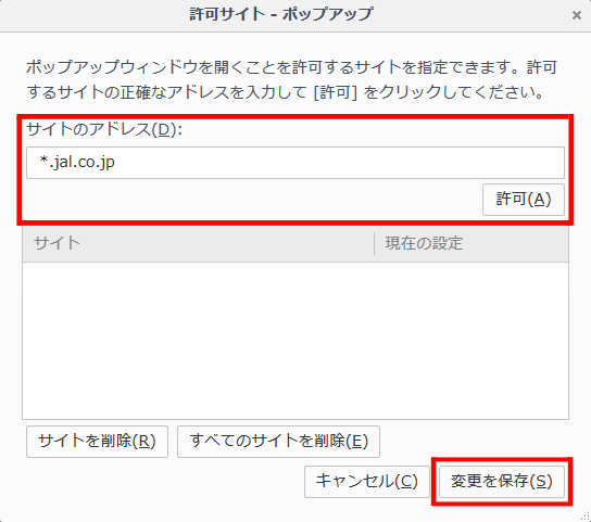 許可サイトのウィンドウが開きますので「サイトのアドレス」欄に「URL」と入力し、許可ボタンをクリックします。「サイト」欄にURLが表示されていることを確認し、「変更を保存」ボタンを押して設定を終了します。