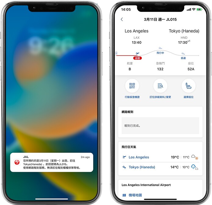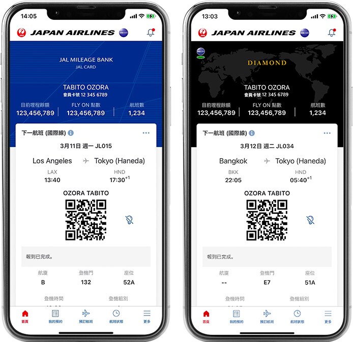 透過 JAL 應用程式行動版登機證,您可以直接前往登機,無需在機場列印登機證。行動版登機證亦可讓您迅速查看最新航班狀態和登機門資訊。