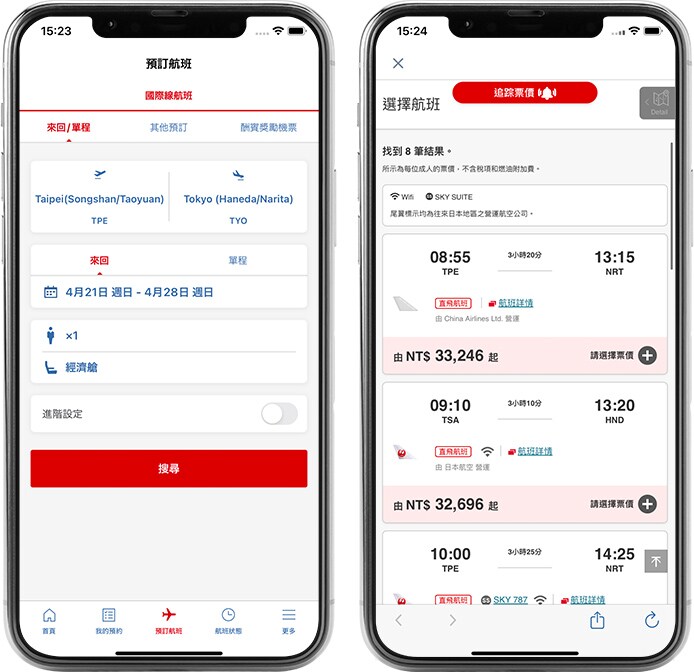 - 您的國際線航班預訂不包含國內線預訂資訊。(當您的城市設定為海外城市時。)