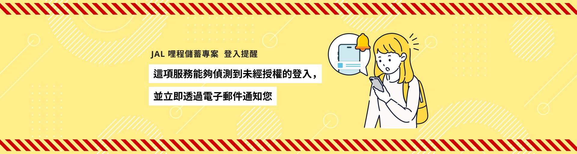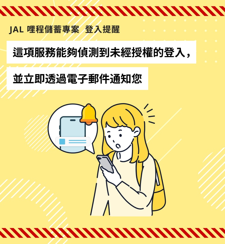 如果您的 JMB 會員資訊和密碼遭竊,而且有人以您的身分非法登入,您將會立即收到登入提醒通知。