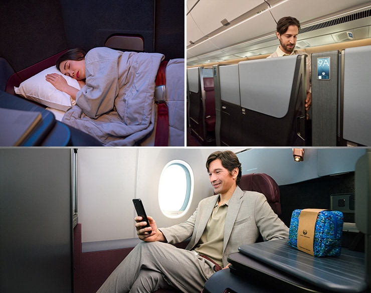 JAL is introducing fully private rooms in our business class cabin. An exclusive personal space awaits behind each door, featuring built-in headrest speakers and a large 24-inch monitor for a completely new cabin experience in the sky. Additional bespoke features, including a private wardrobe, easy-access storage for luggage, and wireless charging, ensure that you have a luxurious and carefree journey.