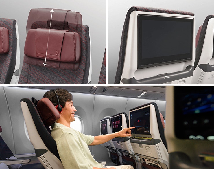 All-new seating offers generous space and comfort. The unique design includes an adjustable recline that is preset at an angle to provide you with a comfortable experience from the moment you take your seat. When it comes to entertainment, the 13-inch 4K monitor is the largest ever offered in our Economy Class and features Bluetooth connectivity, allowing you to enjoy stunning on-screen images and high-quality sound through your own audio device for an even more immersive experience.